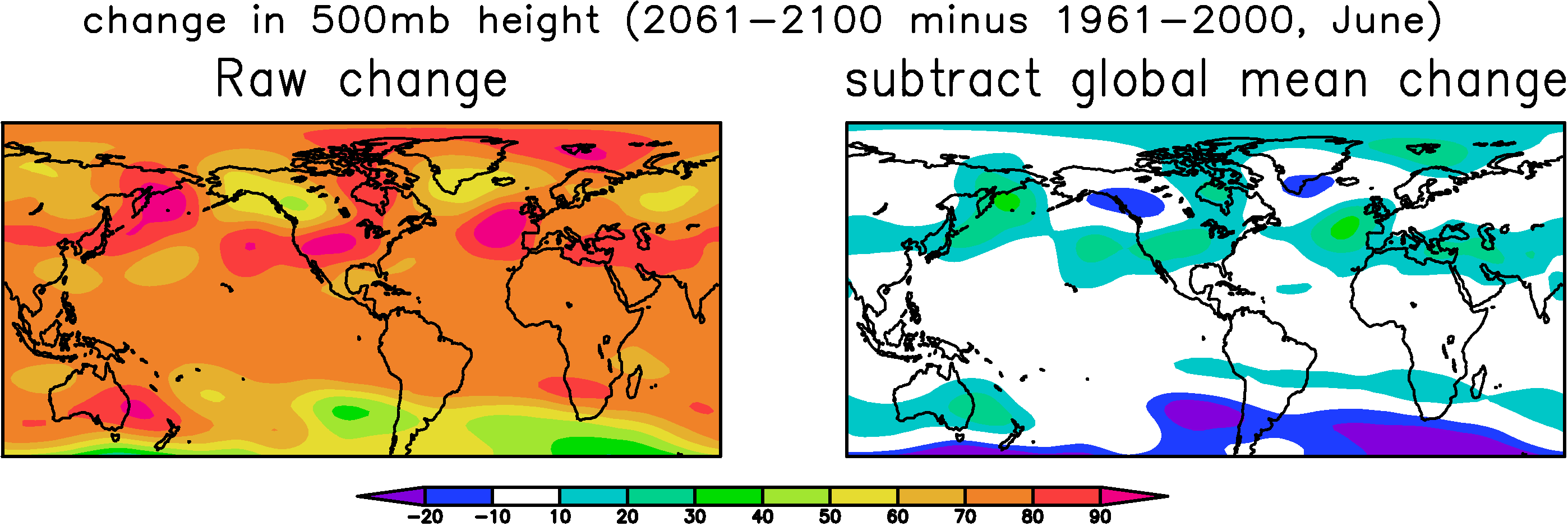 Figure 1: Left) change in time-mean 500mb geopotential height in a particular global climate model. Right) Same as the left but with the global-mean change subtracted from the geopotential change at each point.