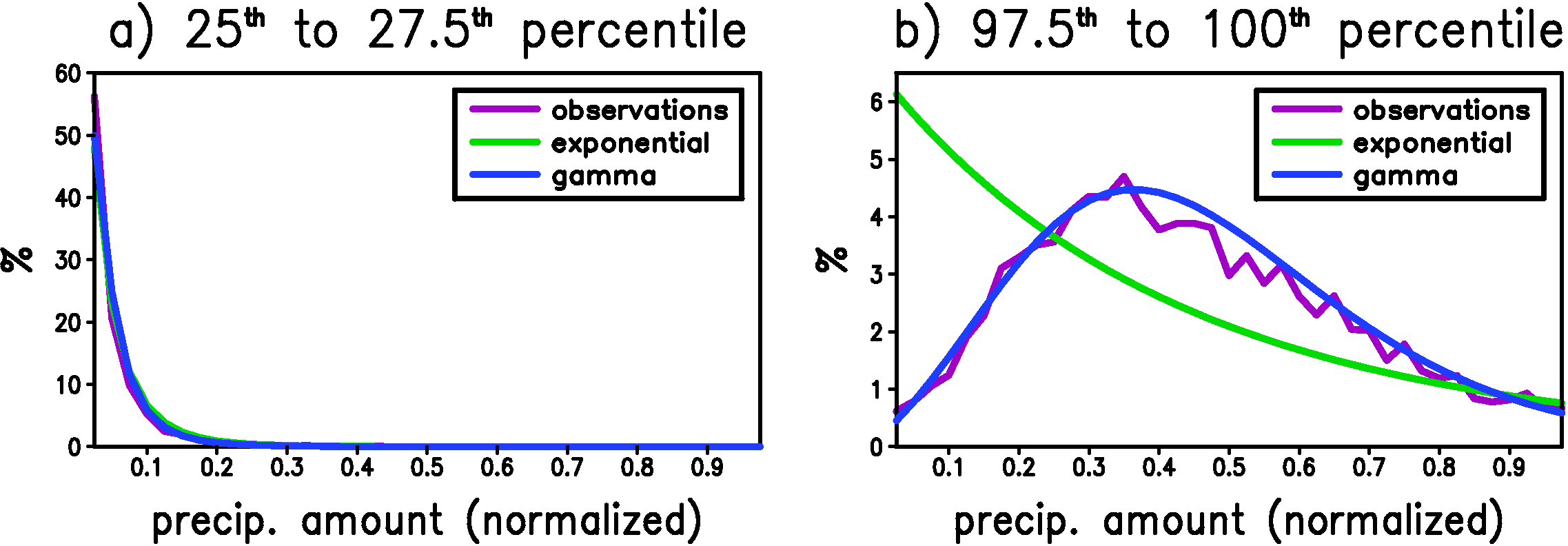 Figure 2: The histogram of precipitation amount when the large-scale predictor is in a) the 25th to 27.5th percentile and b) the 97.5th to 100th percentile. The histogram is an average over all stations. The best fit of the data to both the exponential and gamma distributions is also shown. These fits are performed individually for each station and the result shown is the average over these fits. The precipitation amount on the x-axis has been normalized at each station by dividing by the precipitation amount on the wettest day in the entire record for that station. The y-axis is the number of days in each bin divided by the total number of wet days occurring within the specified range of large-scale predictor. There are 40 bins.
