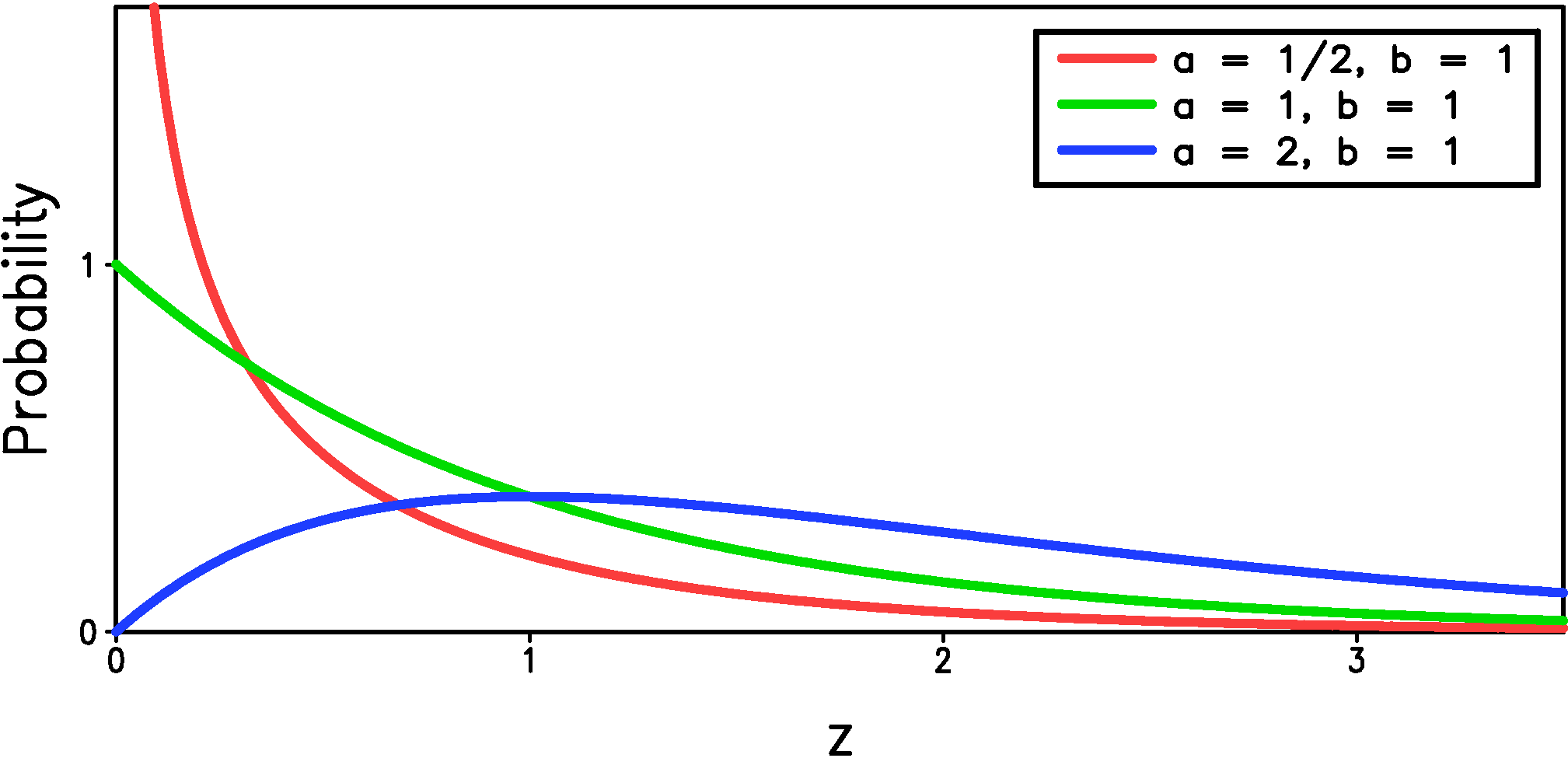 Figure 3: The gamma distribution (equation \ref{eqn:p_am_gam1}) for three different values of the shape parameter, $a$. The scale parameter, $b$, is one in all cases.