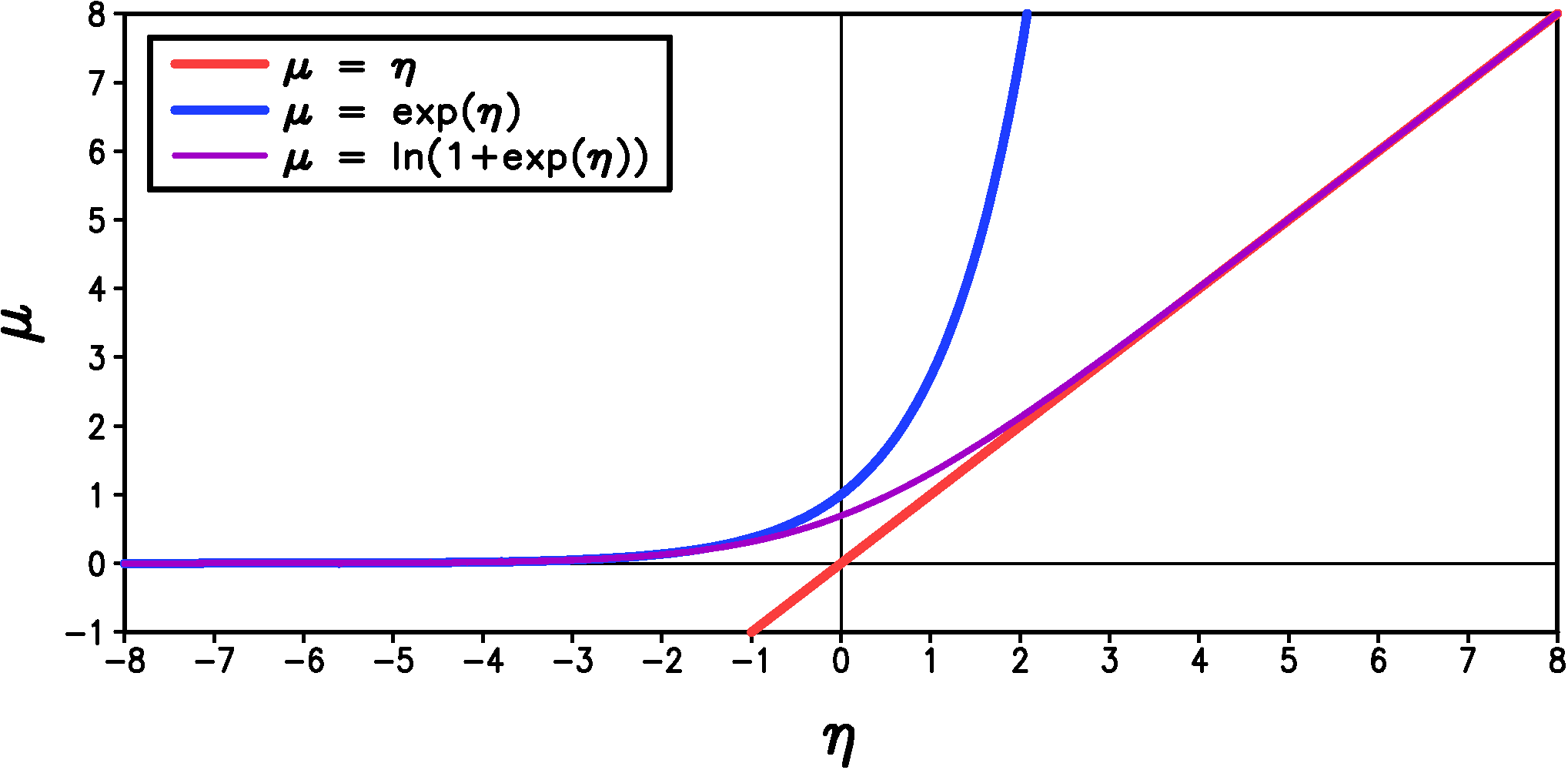Figure 1: A plot of potential inverse link functions for 'exponential' regression.